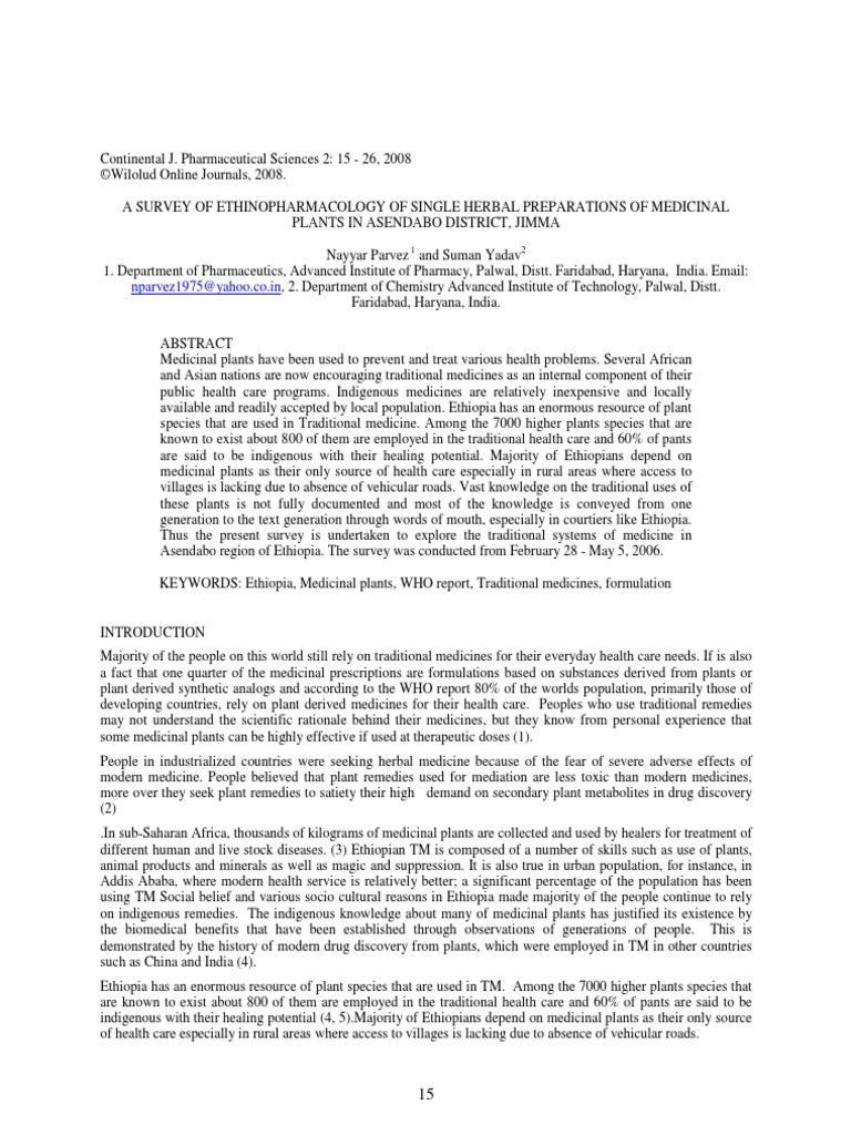 Generally medicinal plants used for traditional medicine play a significant role in the healthcare of the majority of the people in ethiopia. Scientific research on medicinal plants provides additional evidence to the present knowledge of.